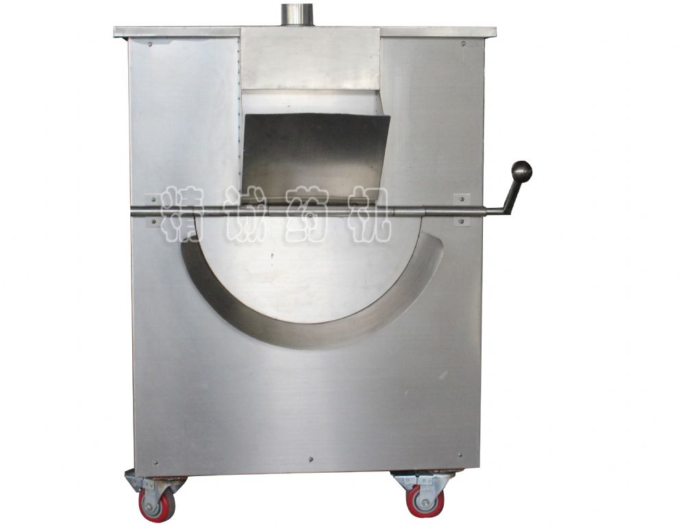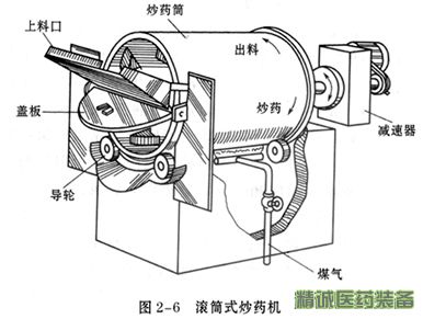滾筒式炒藥機(jī) 由炒藥滾筒、動(dòng)力系統(tǒng)及熱源等部件組成,有的還附有加料裝置的出料裝置,見(jiàn)圖2-6所示。操作時(shí),將藥材通過(guò)筒口加入,蓋如筒蓋板(為了散熱常在蓋板上留有散熱孔)。加熱后,開(kāi)動(dòng)滾筒,借動(dòng)力裝置滾筒做順時(shí)針?lè)较蜣D(zhuǎn)動(dòng)。使筒壁均勻受熱。當(dāng)藥材炒到規(guī)定程度時(shí),打開(kāi)蓋板,按動(dòng)是鈕,使?jié)L筒反向旋轉(zhuǎn),即可使藥材由出料口傾出。滾筒式炒藥機(jī)的熱源可用爐火,也可用電爐可煤氣。